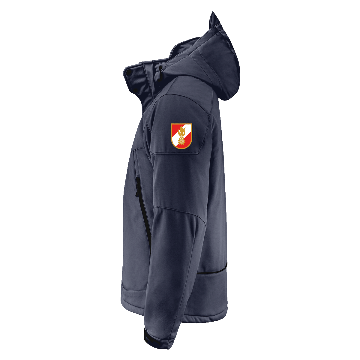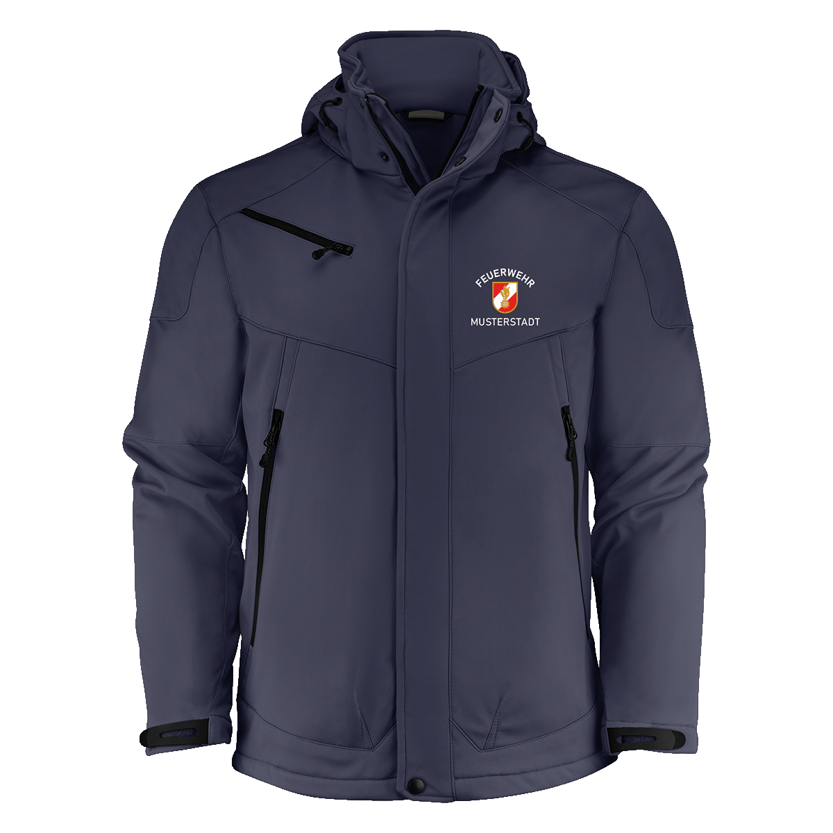 including DTF transfer printing with top quality. On the left front "fire brigade + corps badge + place name", on the upper arm "corps symbol" and on the back "fire brigade + place name"