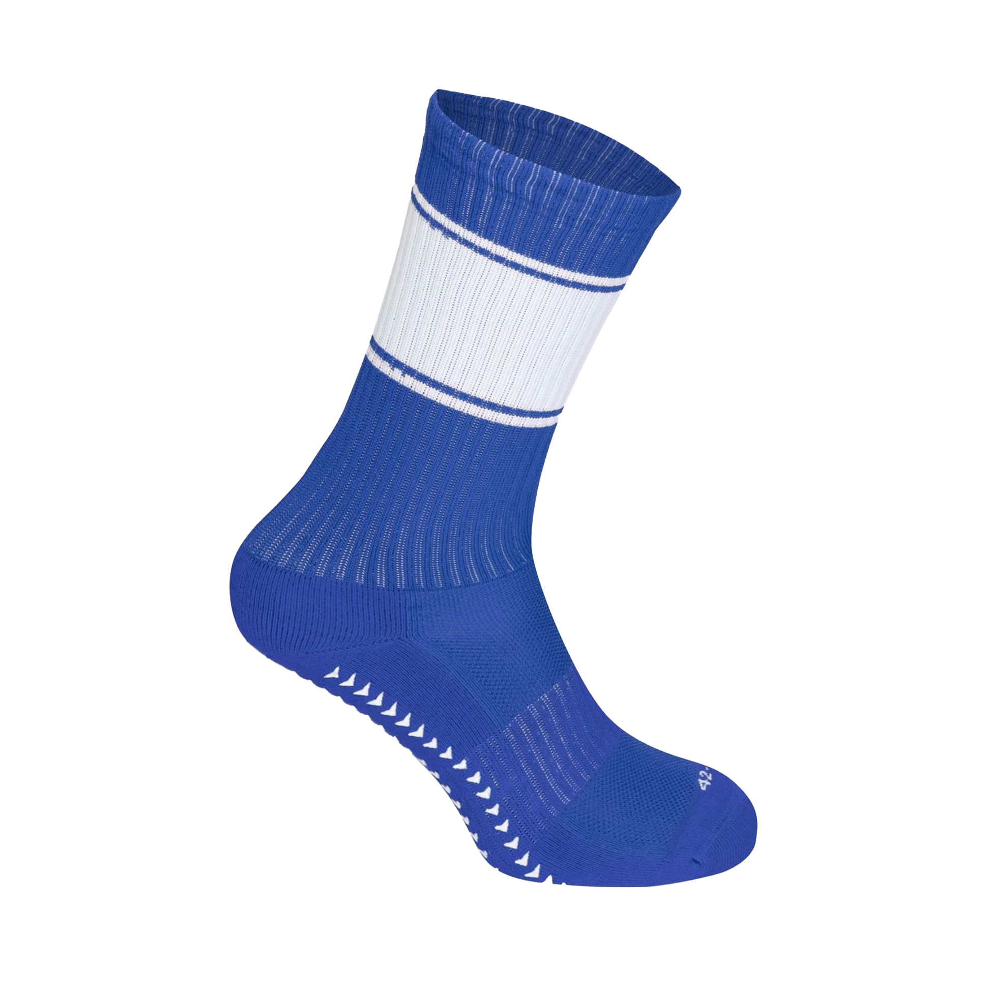 Atmungsaktives Material, Silikon-Grip Material an der Fußsohle für rutschfesten Halt, spezielle Technologie zur Optimierung des Fußstandes, Fußbereich aus Bio-Baumwolle, gerippter Schaft aus recyceltem Polyester, Polyamid und Elasthan, Streifen in Kontrastfarbe, ideal für Sublimation, hergestellt in Europa, Kartoneinleger in jeder Socke für leichtes Bedrucken, 30° waschbar, trocknergeeignet, nicht bügeln
